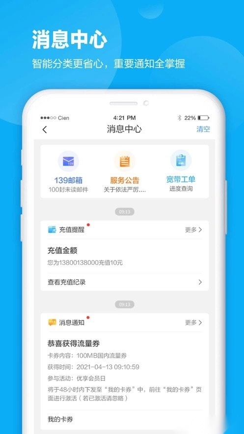 【消息中心】整合139邮箱、服务公告、宽带工单进度查询、各类优惠活动上线通知等内容,重要信息全面覆盖。