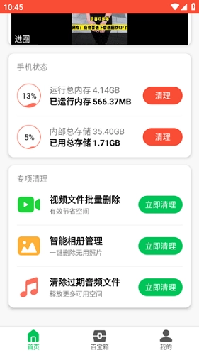 超强旋风清理是一款功能强大的垃圾清理工具,支持一键快速清理功能,用户能通过它高效清除无用文件与不需要的软件,让设备运行更流畅,进而延长设备使用寿命。此外,该软件还集成了万年历、天气、健康等丰富功能,用户无需下载多个应用,就能在一个软件中使用多种服务,有效节省设备存储空间。应用管理页面可帮助用户快速了解已安装的软件,并便捷地进行卸载、清理操作;同时,用户还能直接通过这款软件进行内存清理优化,其功能全面,可实时清理设备内各类顽固垃圾文件,提升设备运行速度。 软件采用先进的清理算法,提供快速清理、深度清理、定时清理等多种模式,满足不同用户的个性化需求。在清理过程中,它会自动备份被删除的文件,避免误删重要数据,并且配备还原功能,全方位保障用户的数据安全。作为一款实用的清理工具,超强旋风清理能够深层次扫描设备垃圾,只需一键操作就能让设备运行更流畅,还能更好地保护用户隐私安全,防范病毒侵害设备。喜欢这款软件的朋友千万不要错过,赶紧来体验吧!