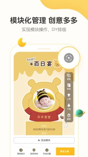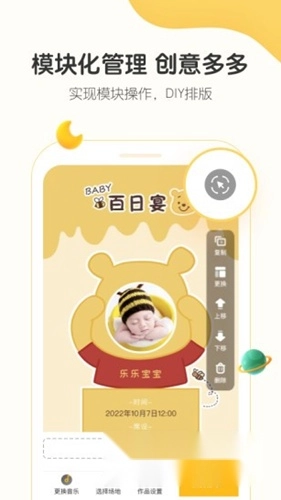小宝拾光是一款专注于音乐相册与请帖制作的专业软件。借助它,用户能轻松打造出洋溢着欢乐氛围的儿童音乐相册,把宝宝童年里那些珍贵的回忆,以音乐相册的形式妥善留存。除此之外,用户还可以利用它制作宝宝满月酒等各类请帖,整个过程支持一键生成,操作便捷易懂,且充满童真趣味,使用体验十分出色。