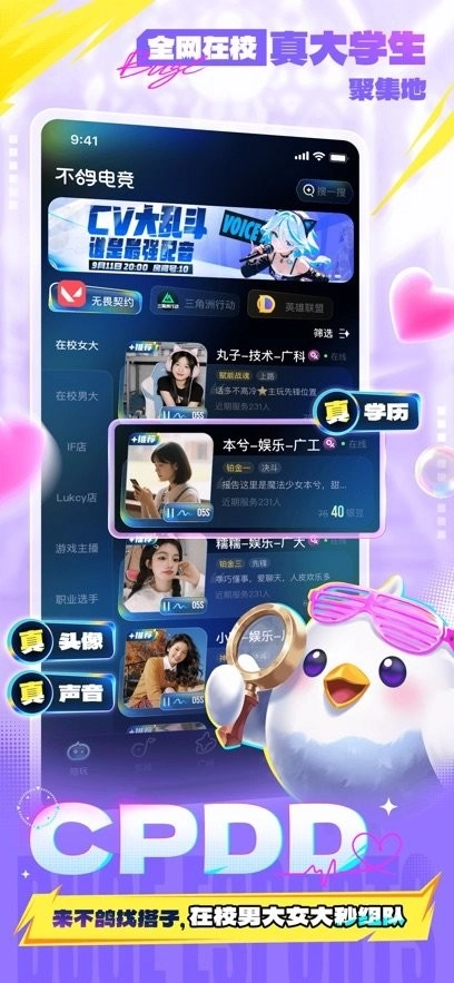 这是一款面向在校男女大学生的开黑组队软件,平台上汇聚了数万经过认证的大学生陪练师,能为用户提供高水平且有保障的陪伴服务。软件以海量高校学生作为核心用户群体,营造出充满活力、易于产生共鸣的青年社区氛围。