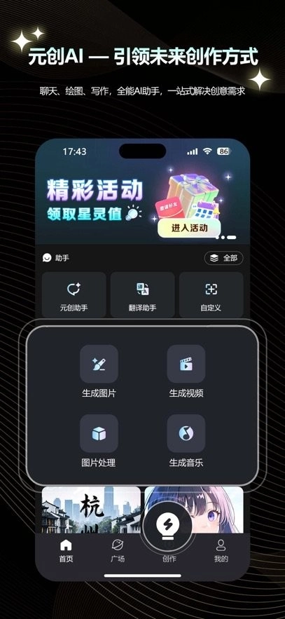 5.【一站式平台 - 告别频繁切换】 无论是文案、图像还是其他AI创作需求,一个App就能全部满足!元创AI融合了多项前沿AI技术,为您打造流畅且便捷的创作体验。帮您节省宝贵时间,有效提升创作效率,让创意持续涌现,助力您轻松达成创作目标。
