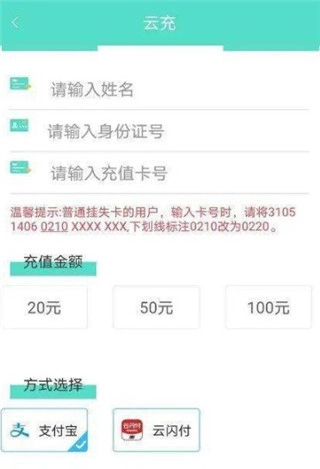 2、点击“公交卡充值”选项,依次填写姓名、身份证号和充值卡号,接着选择想要充值的金额,完成充值操作。