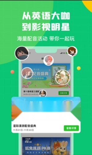 4.【兴趣群聊】这里汇聚了众多热爱英语的男神女神、配音达人,随时关注他们的动态,畅快聊天,找到属于你的兴趣圈子!还能把你的配音作品分享到朋友圈,收获大家的赞赏与膜拜!