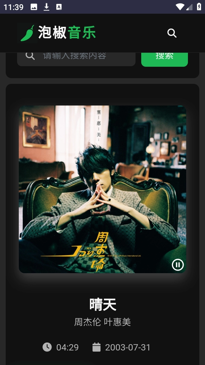 1、在泡椒音乐里搜索目标歌曲,得到的搜索结果是默认音源。