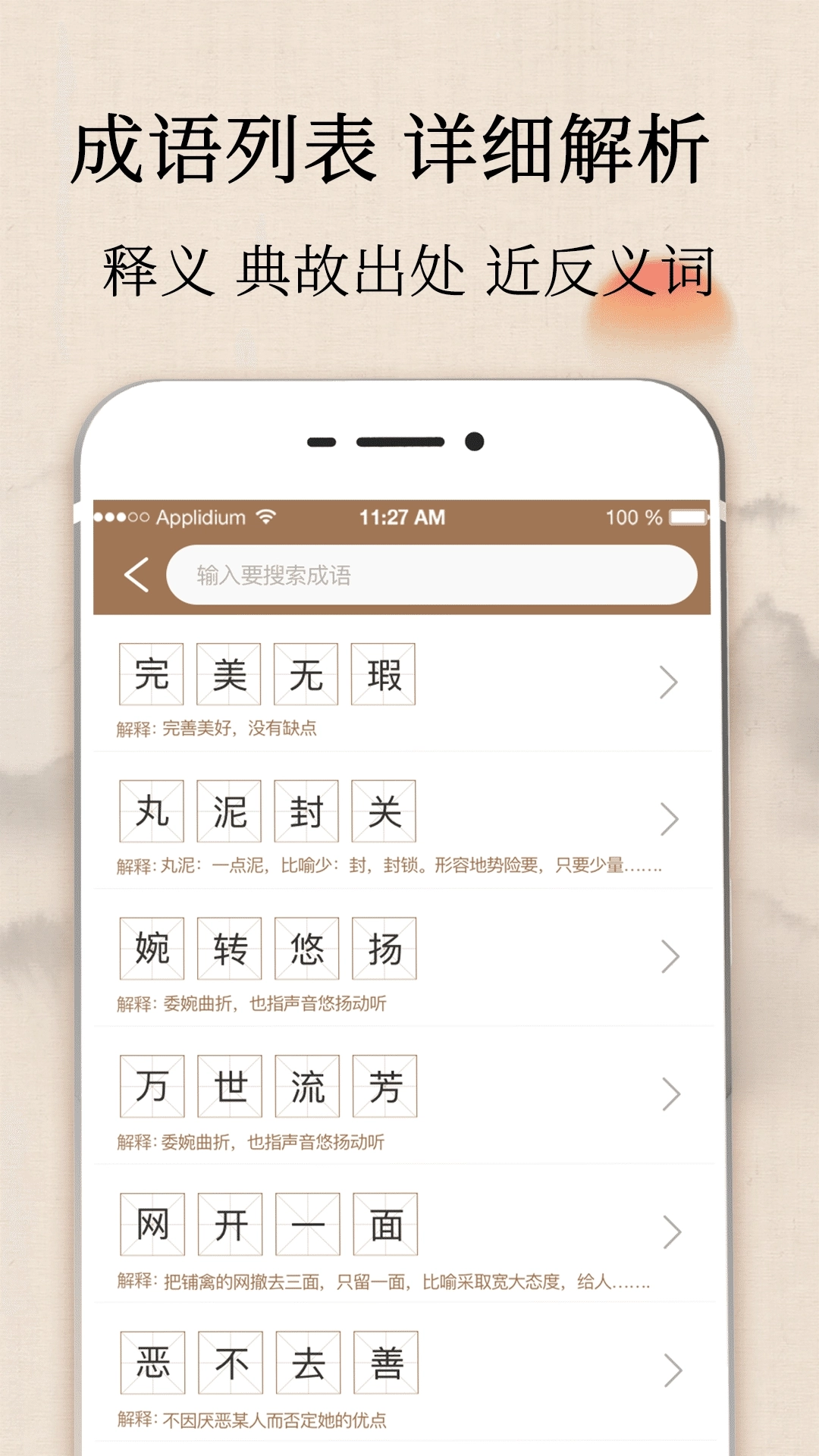3、解释详尽:每条成语都涵盖发音、释义、出处、示例、近反义词以及造句等完整信息。
