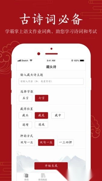 无论是即兴赋诗、表白心意、愚人玩笑,还是欣赏诗句、陶冶情操,它都是必备神器;拥有超巨量诗词库,支持字数字体设置、韵脚位置调整,新增谐音正音功能与藏字位置设定,还可一键分享。
