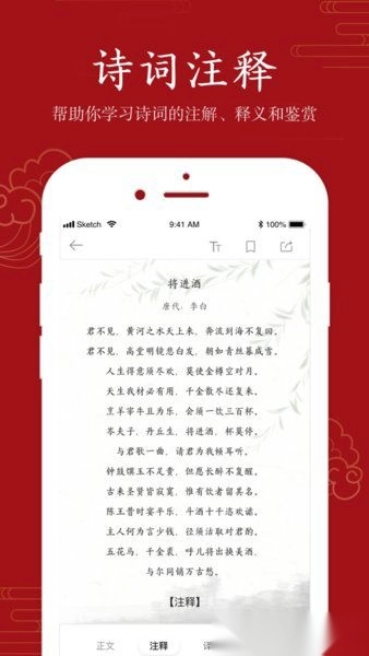 涵盖唐诗、宋词、元曲、古诗、古文、文言文、乐府诗、《全唐诗》《全宋词》等内容,并且同步呈现诗词的注解、释义与鉴赏。