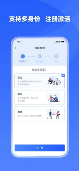 2、选择“家长”身份,点击“下一步”继续;