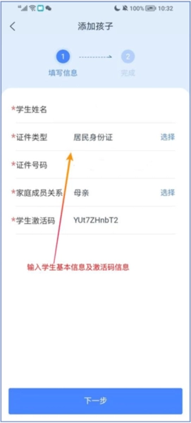 3、家长在注册界面需填写学生信息、学生激活码以及家长信息,勾选服务协议后点击【下一步】;待学生信息校验通过,家长设置好自己的登录用户名与密码,再点击【下一步】即可进入首页。