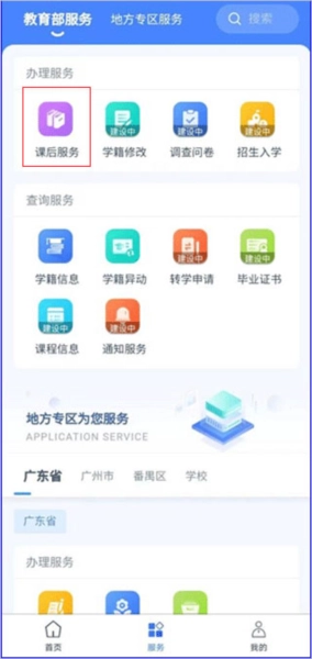 在登录页面输入对应的账号和密码,即可进入应用。接着,在页面底部切换到【服务】栏,家长能够在【办理服务】里,点击【课后服务】,从而进入课后服务页面。
