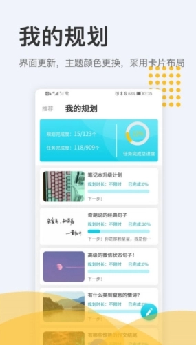 软件结合大数据为用户打造了卡片式布局的规划表,同时提供各类热门规划模板,方便用户借鉴他人计划的优点并融入自身规划。用户在执行计划时,可记录每日变化,随时回顾成长轨迹。这款软件尤其适合缺乏生活规划的用户,能帮助他们养成制定计划的好习惯,让各项事务有条不紊,有效提升生活与学习效率,满足多样化的生活规划功能需求。