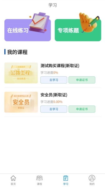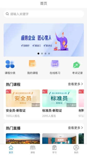 学教在线设有互动交流板块,方便师生随时沟通。学生可通过平台提交作业,也能利用题库开展模拟练习。平台具备在线测评与评估系统,支持用户在线学习并获取教师的批改反馈。平台汇聚了丰富的优质课程,涵盖安全员、材料员等岗位相关内容,供用户在线学习。完成注册认证后,用户还可获得电子合格证书。