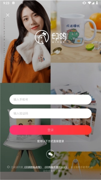 打开印鸽应用后,按照界面上的提示完成注册或登录步骤。注册与登录的方式可选择手机号、微信、QQ等。
