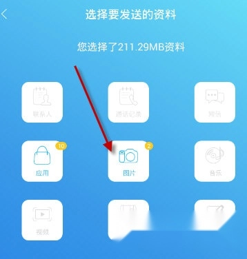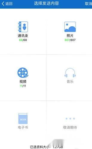 3、选择“我要发送”功能后,界面会显示可传送的文件类型。选定需要传送的文件后,该文件的图标会变为蓝色。确认要传送的文件后点击发送按钮,同时新设备中的换机精灵会自动与当前设备搜索匹配。