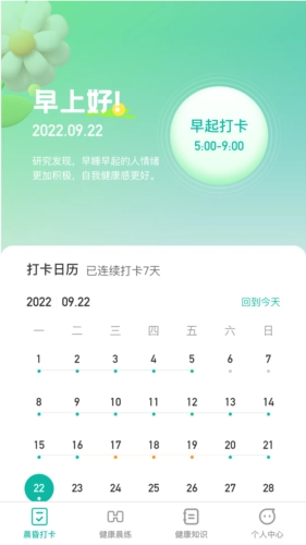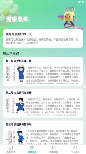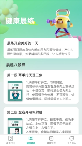 晨昏享健是一款专注于健康生活的多功能助手,能帮助您更好地呵护身体,开启活力满满的一天。有需求就来体验,提升身体的灵活性,收获更理想的健康成效。应用采用相对轻松的管理模式,您可以跟随指导进行晨练,从而提高生活品质。它还为您提供早晚打卡功能,方便记录睡眠状况等信息。晨昏享健,是不少朋友都需要的健康好帮手。