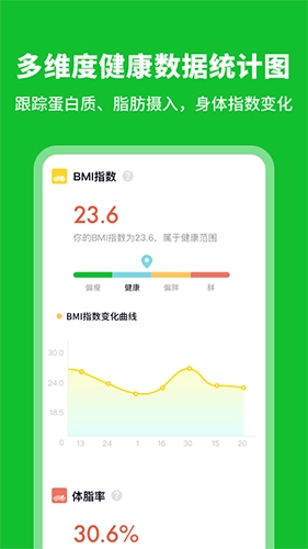 4、健康报表:通过多维度健康数据统计图进行日常统计与更新,不仅跟踪蛋白质、脂肪的摄入情况及分布变化,关注的也不只是卡路里,更涵盖了营养层面的全面监测。