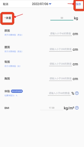 2、在此处可记录体重,系统会自动显示BMI值,操作时点击右上角的“保存”按钮即可。