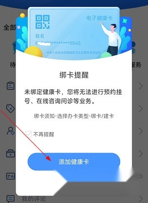 1、第一次打开安医大二附院的相关应用时,会出现绑定健康卡的提示,此时点击添加按钮即可。