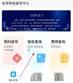 1、打开空军特色医学中心的官方网站首页,找到并点击“报告查询”选项。
