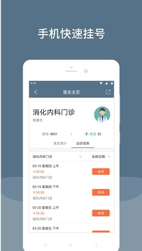 【预约挂号】可实现本院所有科室普通门诊与专家门诊的预约挂号及实时挂号操作,患者仅需一部手机,就能完成预约挂号流程。