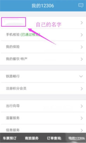 2、在“我的12306”这个界面,我们点击一下自己的名字所在的位置,就像图里显示的那样。