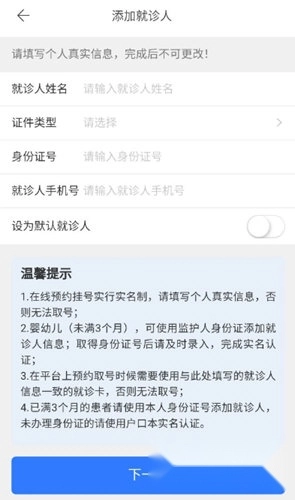 2、选择添加就诊人,依次输入就诊人姓名、证件类型、身份证号以及就诊人号,随后点击下一步。