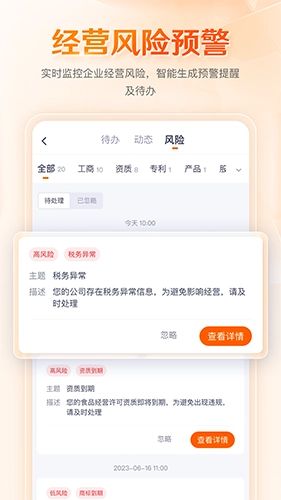 2、在八戒企业管家中,用户能够查看企业经营风险的预警信息。