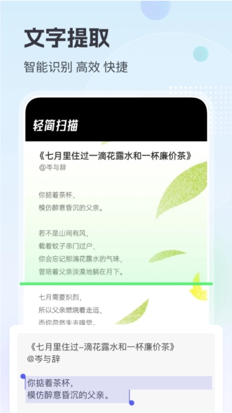 轻简扫描具备全面的兼容性,不管是印刷字体、手写笔迹,哪怕是面对复杂的图片背景,都能出色处理,充分展现其卓越的文字识别能力。