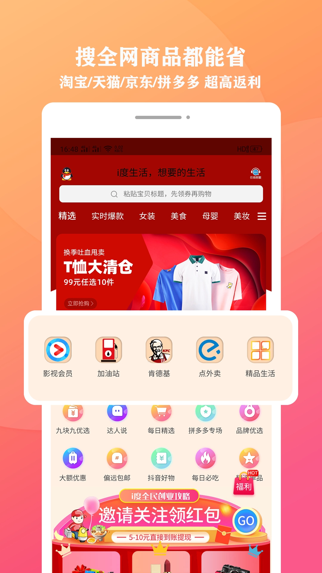 i度生活是一款集成购物精选、高额佣金、每周新品、外卖优惠等功能的生活专属软件。它结合淘宝、天猫、京东、拼多多等平台进行比价,能帮助你快速找到物美价廉的实惠商品,还能带你抢各类隐蔽优惠券,致力于让用户尽享购物与点餐的实惠服务。