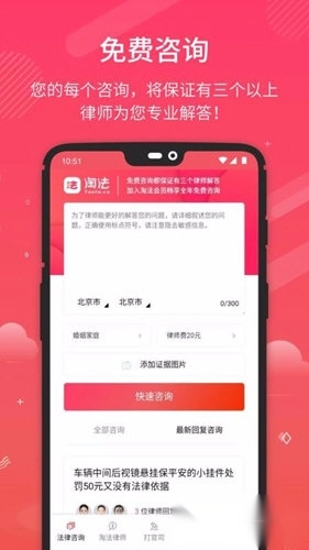 法律咨询:淘法不仅确保每一个法律咨询都能得到律师的回复,还会让每个咨询获得三位律师的解答,同时借助评价与排名机制,促使广大律师尽可能提供更优质的解答。