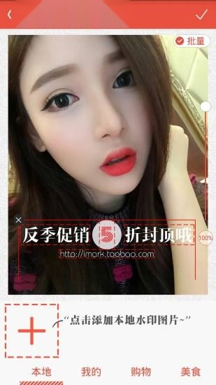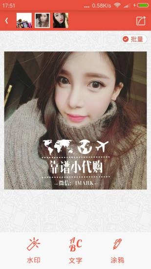 1、批量加水印:微商无需再为给大量图片添加水印而烦恼,美图爱水印能够一键批量为精美拍摄的写真图片添加水印,是必备的美图相机打水印软件!