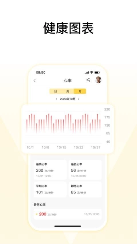 提供了针对长者心率健康的图表分析,可便捷查看心率变化趋势。