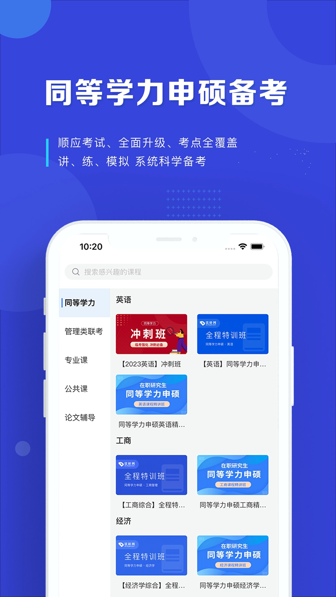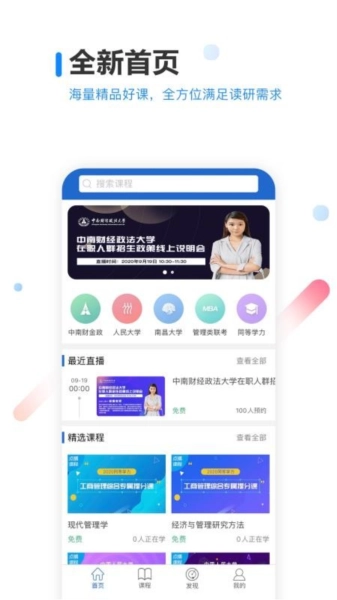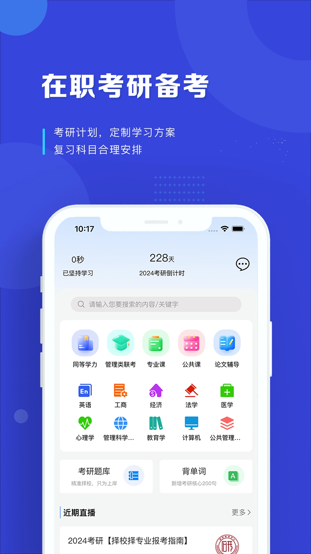 这里有海量优质的考研学习课程,用户能根据自身需求挑选合适的课程学习,还聚集了众多名师专家,你可以和他们互动交流,遇到不懂的问题能及时提出,会得到及时解答,从而获得更好的学习效果;不仅为用户提供大量课程资源,还有考研题库,涵盖各类题目,也提供多种练习方式,让你能找到适合自己的练习模式进行练习,轻松快速掌握各种知识点,而且这里为用户提供的所有资源都是免费的,无需你花费任何费用。