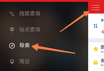1、点击阳泉公交通首页左上角的三条杠按钮,待弹出选框后,点击其中的导乘选项。
