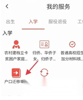 1、进入“我的服务”板块,选择“入学”选项,点击“户口迁移审批”入口进入。