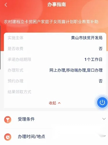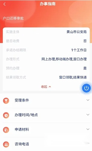 2、进入户口迁移审批办事指南页面,点击下方的“在线办理”按钮进入办理界面,输入相关信息提交申请。
