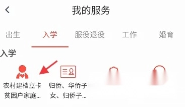 2、进入“我的服务”页面,找到页面下方的“入学”选项,点击“农村建档立卡贫困户家庭”进入。