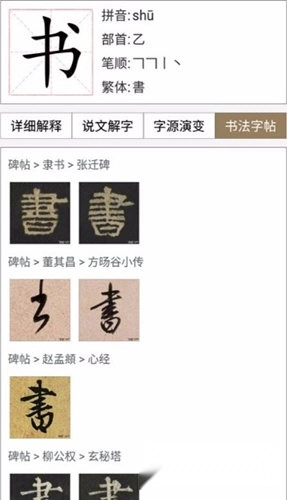 3.这里收录了众多名家的汉字碑帖,用户借此能清晰了解汉字的书法相关信息。