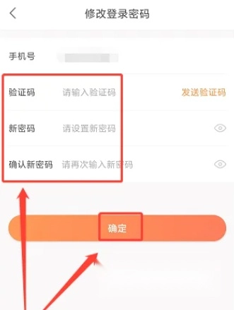 4、进入登录密码修改界面,依次输入验证码、新密码和确认新密码,然后点击【确定】按钮。