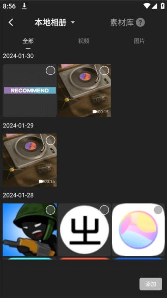 2、挑选一个视频,既可以从本地相册里选取素材,软件自带的素材库中也有丰富的素材可供选择。
