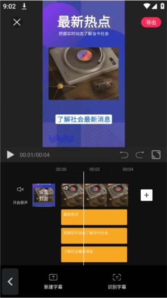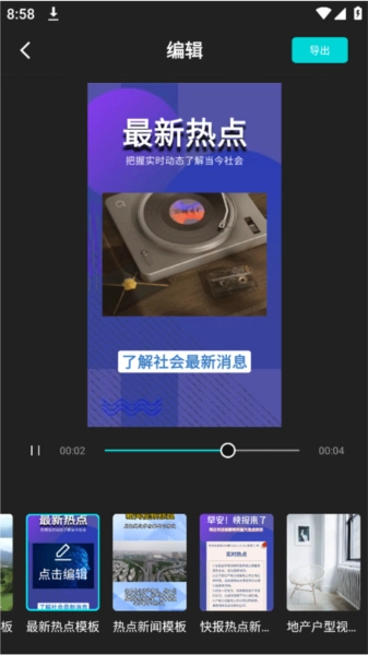 4、接着点击右上角的“编辑”按钮,就能进入编辑界面,在这里可以对模板的音乐、文字等内容进行修改,编辑完成后点击右上角的“导出”按钮即可。