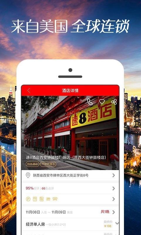 可以快速便捷地预订全国200多个城市的近千家速8酒店,还能随时查看离您最近的速8酒店。