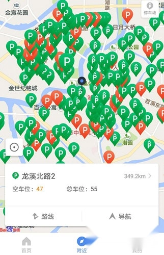 1、打开湖州停车应用,在附近的地图功能界面中能看到周边的停车场所,点击对应的P功能按钮就行。