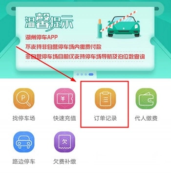 1、在湖州停车的“首页”功能界面中,能找到“订单记录”这一功能选项,点击该选项就能进入对应的页面。