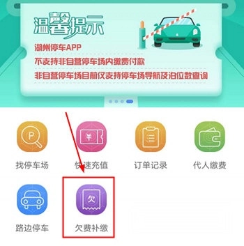 1、同样地,在湖州停车的“首页”里,选择并点击“欠费补缴”这一功能选项。