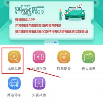 1、在软件首页找到“找停车场”的功能选项,点击进入。