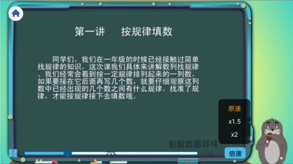 在葱喵儿奥数课程页面里,支持倍速播放功能,当下方的进度条显示为百分百时,就意味着该课程的学习已完成,而且你也能够反复观看课程内容。