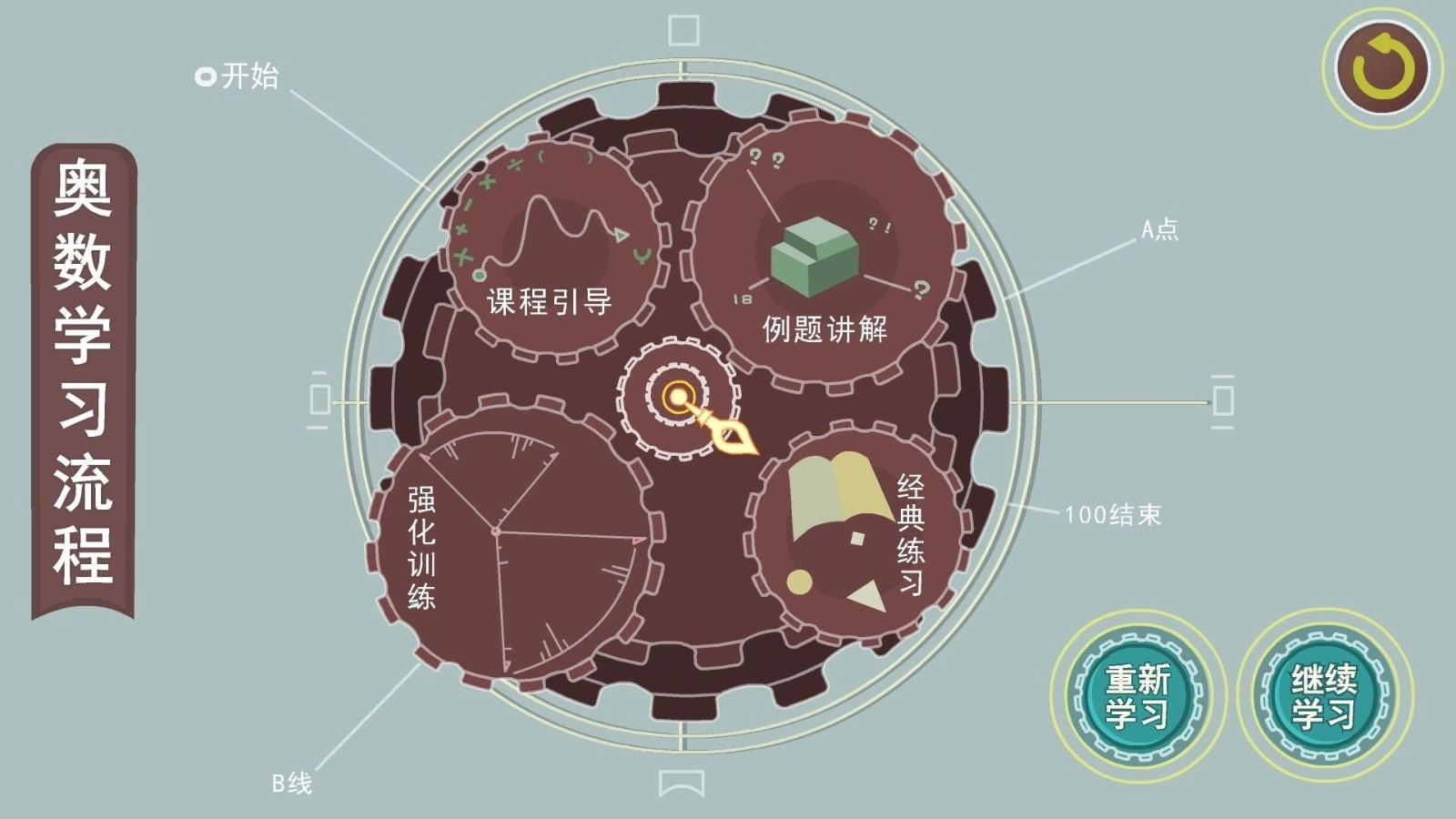 “奥数讲堂”的每一讲都设有“课程引导”“例题讲解”“经典练习”“强化训练”四个学习环节,并且每一讲都配有对应的学习状态标识,初始状态为“未学”。
