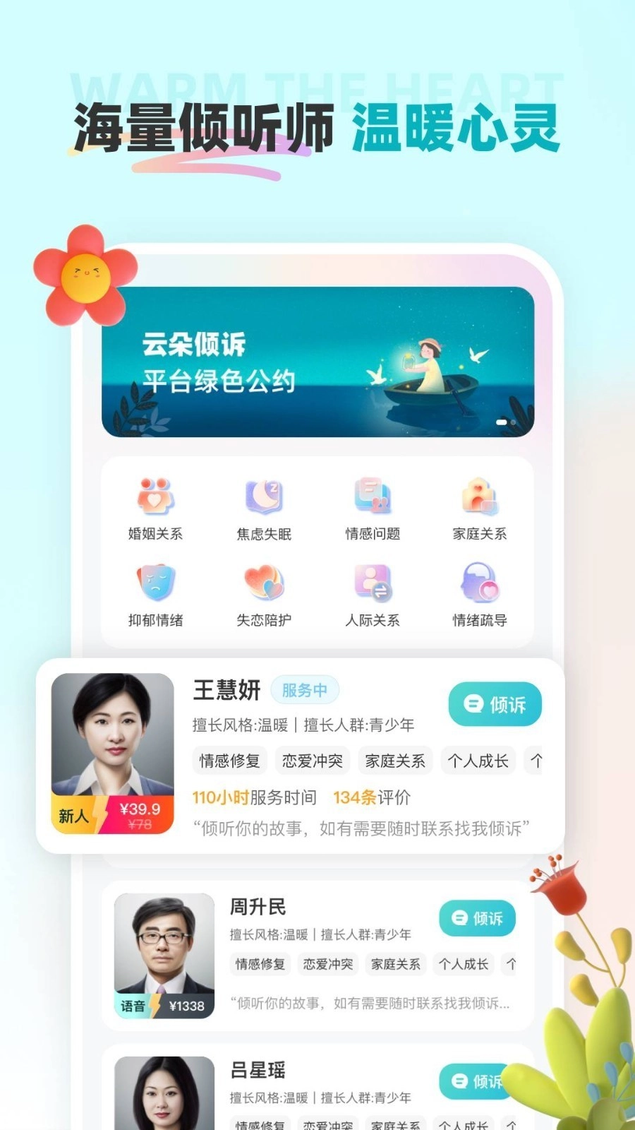 1、这是一款聚焦于情感倾诉的软件,能为用户提供安全且匿名的交流空间。