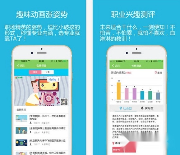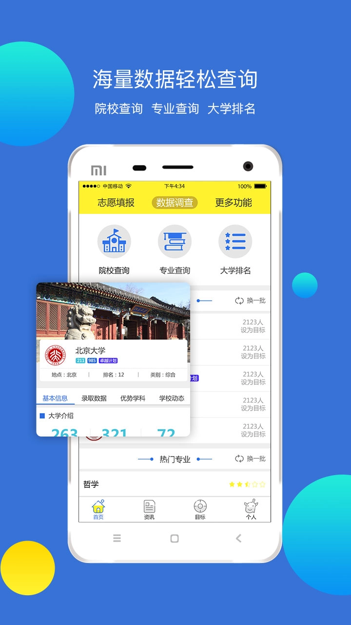 3.院校专业推荐 整合全国2500多所高校的录取数据与就业信息,结合职业兴趣测评结果及当前目标成绩,为用户推荐兼具个人喜好、自身优势与社会需求的院校及专业。
